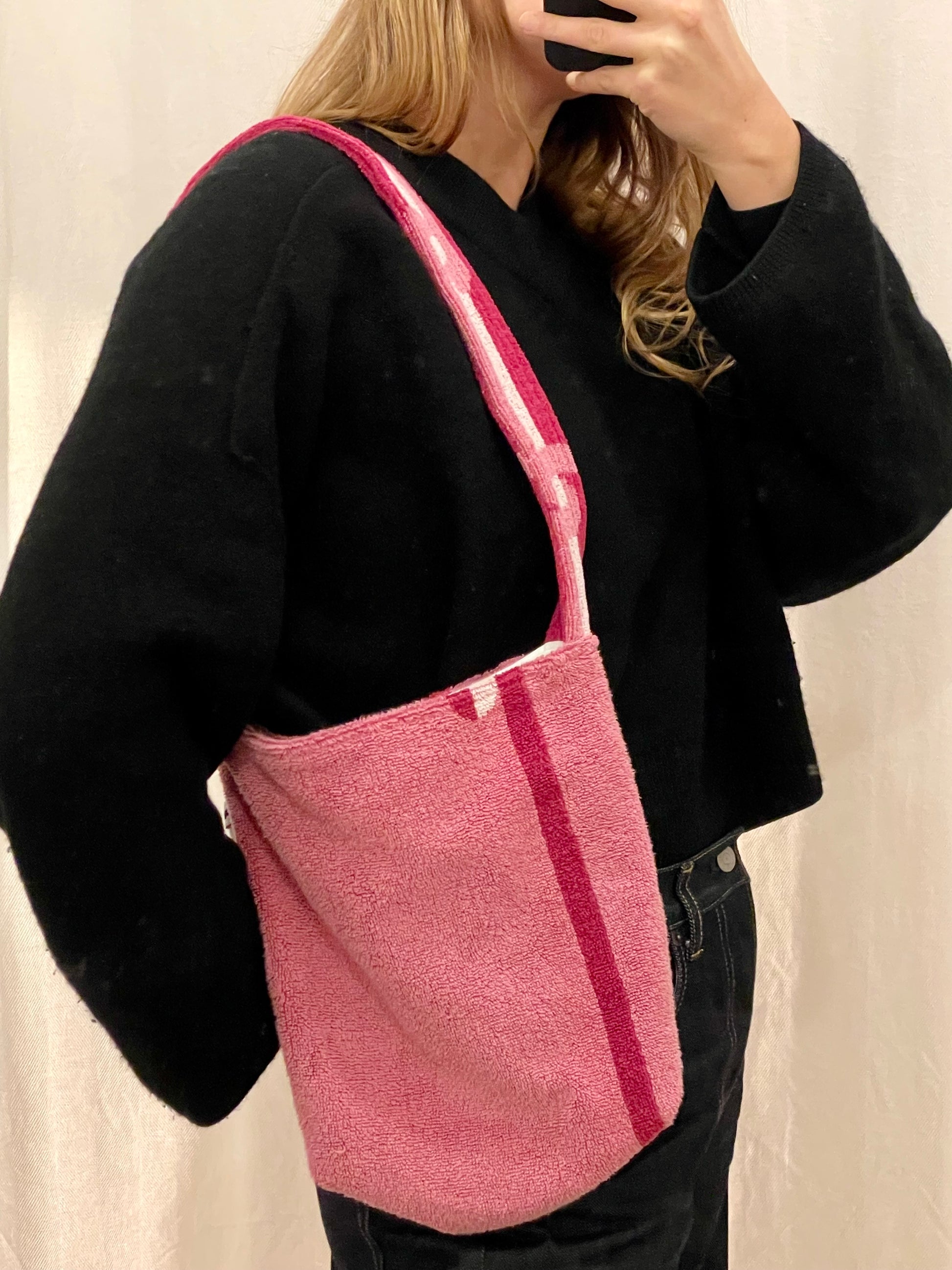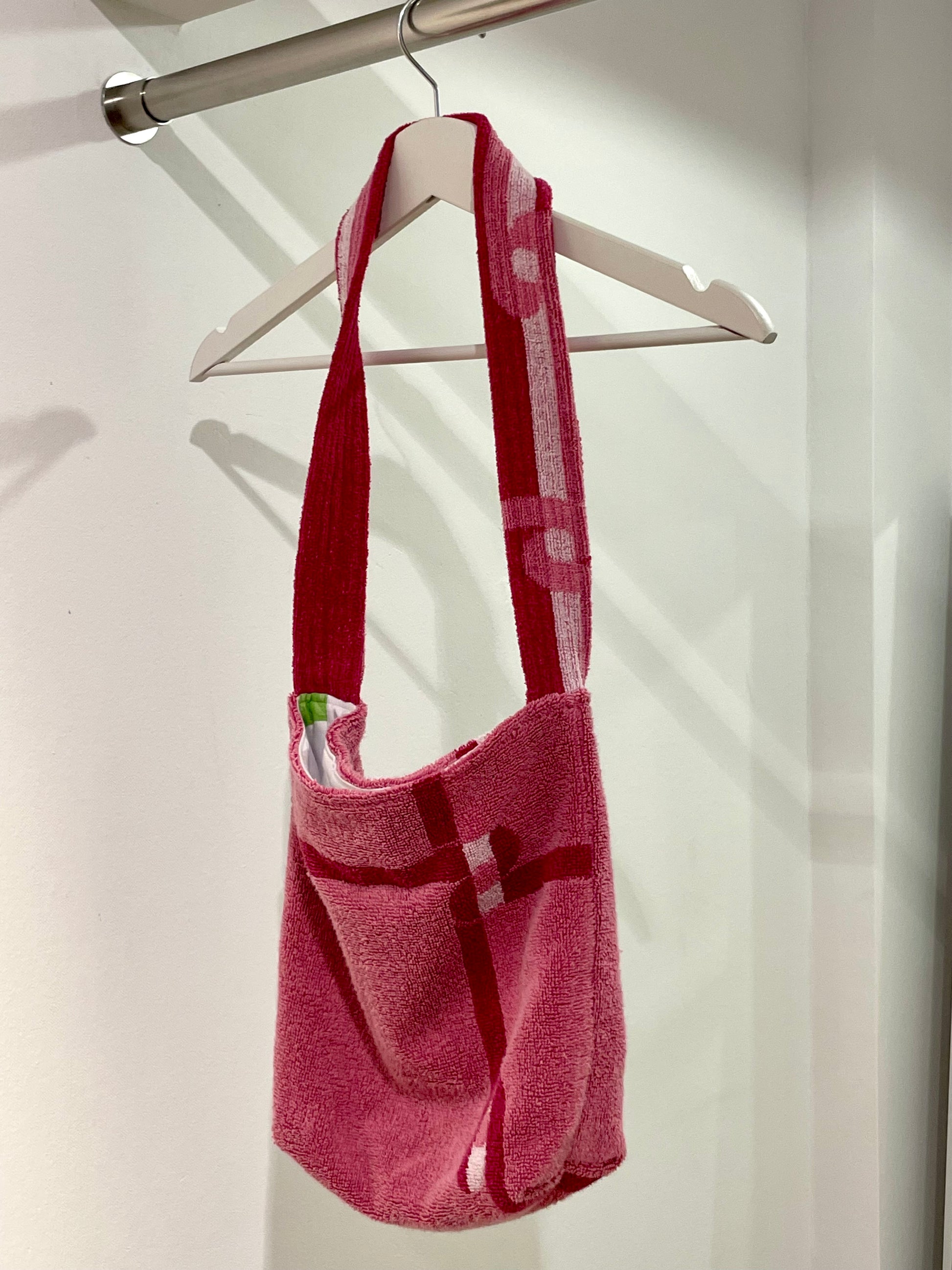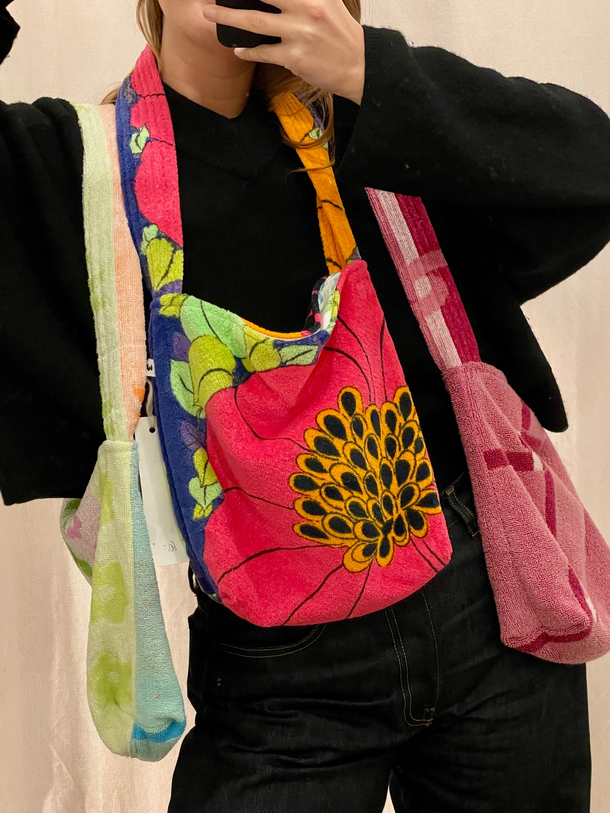 Alle Stoffe sind vorgewaschene Vintage-Materialien. Für Langlebigkeit empfehlen wir die Wäsche per Hand. Wenn du die Tasche in der Waschmaschine waschen möchtest, empfehlen wir die Wäsche in einem Wäschesack, um zu vermeiden, dass das Frottee in Kontakt mit scharfen Gegenständen kommt.