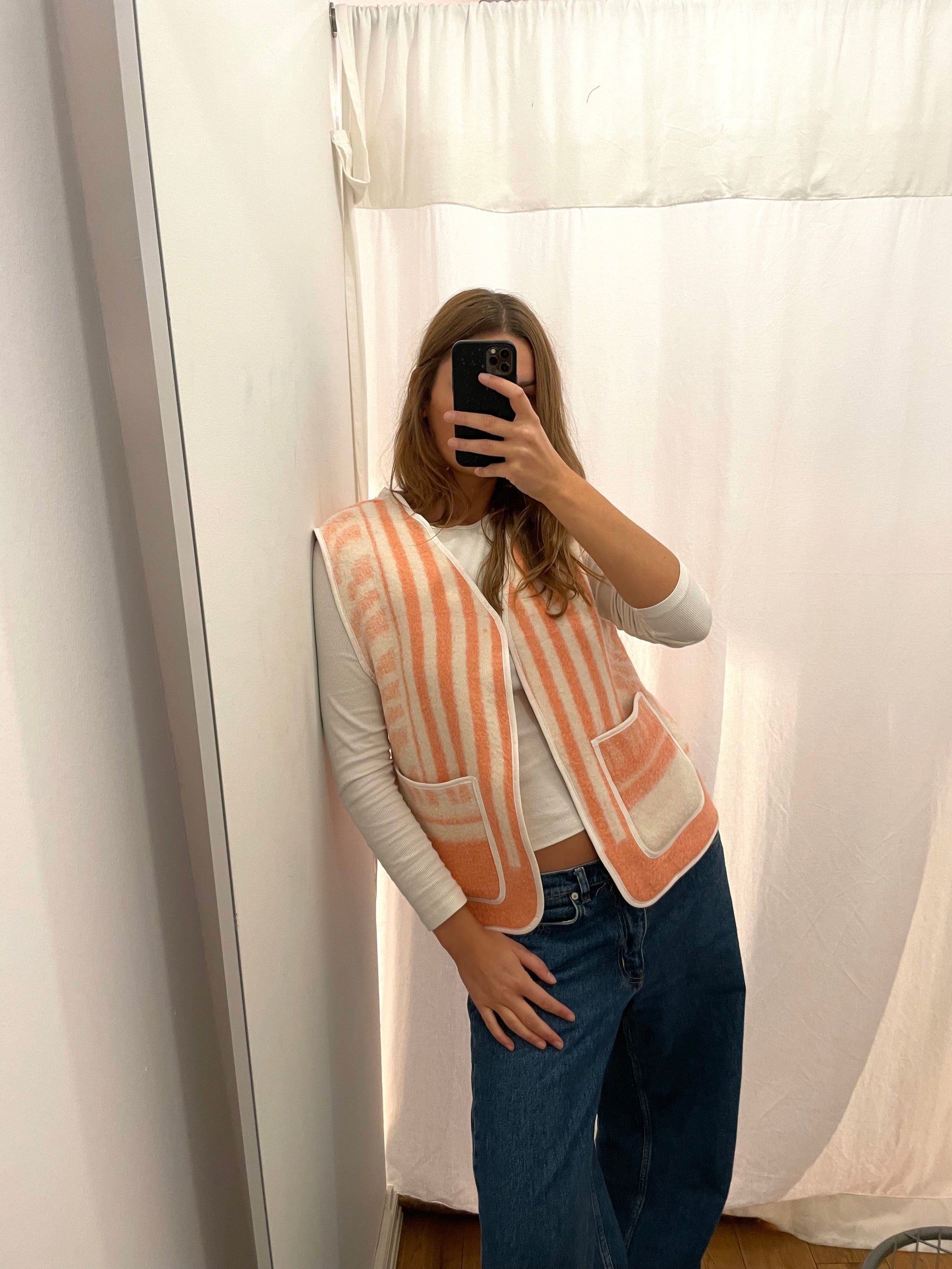 Wir empfehlen Handwäsche mit einem milden Waschmittel. Wenn Maschinenwäsche nötig ist, sollte die mit ähnlichen Farben und niedrigem Schleudergang gewaschen werden. Trockne die Weste hängend oder liegend. Sie kann gesteamed werden, wenn nötig.